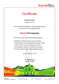 2022年9月6日~7日、弊社赤外カメラ営業担当 森が、ドイツのドレスデンにて、研究開発や非破壊検査などの用途に向けた高性能なハイエンドサーモグラフィ、『ImageIR®シリーズ』などを製造販売するサーモグラフィメーカー、InfraTec社のInternational Sales Meetingに参加し、同社が監修する製品トレーニングを修了いたしました。