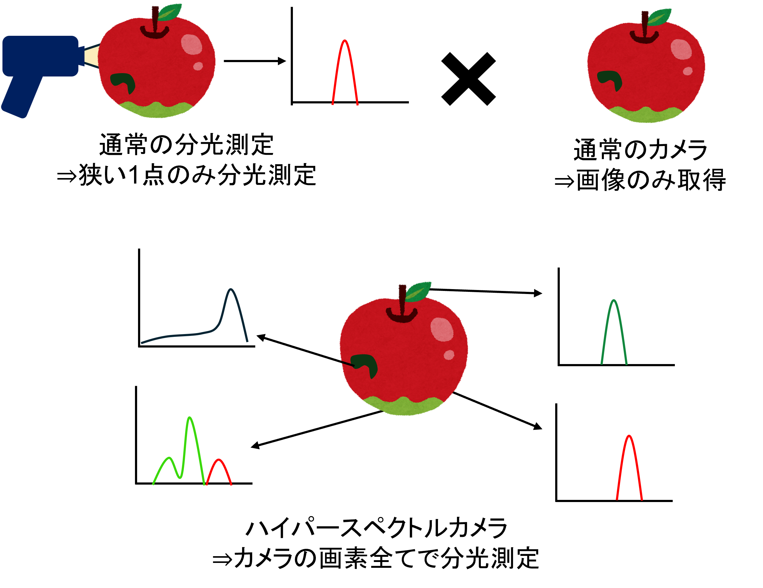 通常のカメラでは画像は取得できますが、分光情報は得られません。 通常の分光測定は狭い1点のみの分光情報が得られますが、場所ごとの分光情報の違いなどは見分けることができません。しかしハイパースペクトルカメラであれば、1画素毎に分光情報を持っているため、異物の混入や、傷んだ部分などもスペクトルから見つけることが可能です。また人の目には見えない近赤外域の光を取得するカメラを使えば、ヒトの目では分からない異物や、傷み、汚染なども見分けることが可能になります。