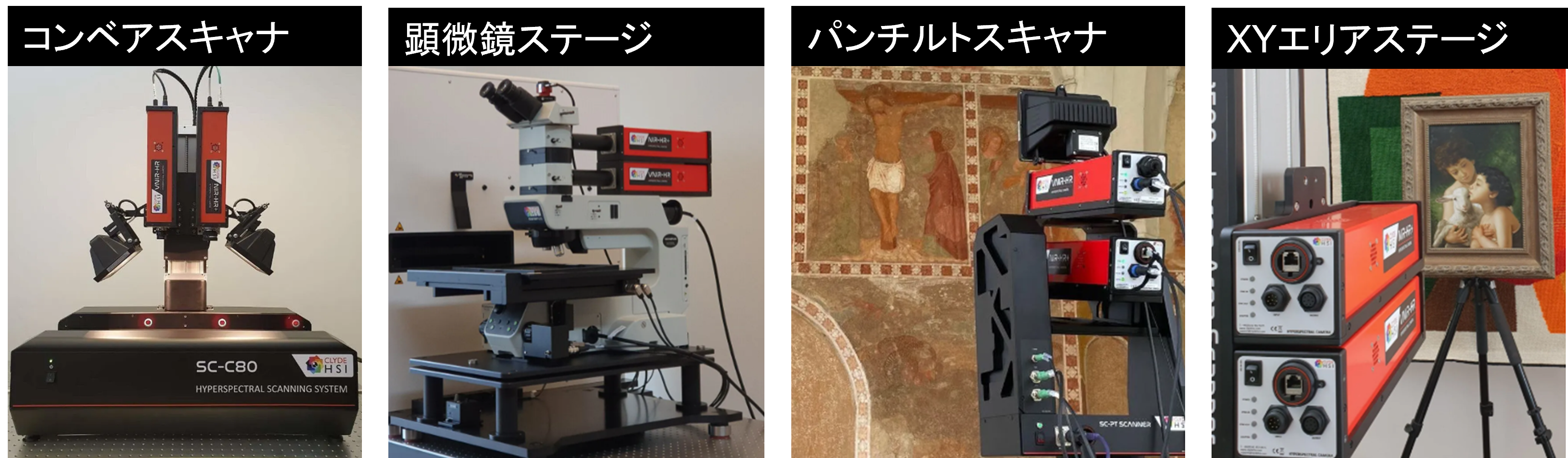 スキャン機構は測定対象に応じて、適切なものを選択する必要があります。例えば食品のようなものであればコンベアが適しておりますし、貴重な絵画や壁画などは測定対象を動かすことが現実的でなくカメラを動かすスキャナが適しています。標準ラインナップとして以下のようなスキャン機構をご紹介できるため、選択肢が豊富なことも特徴の一つです。またご希望に応じて特注のスキャン機構をご提案することも可能です。
