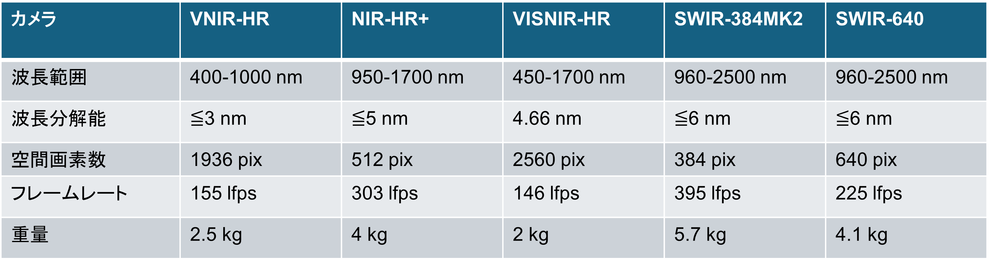 ※これらのカメラのほかに解像度が低い廉価版も各波長帯(VISNIR-HRを除く)に存在します。