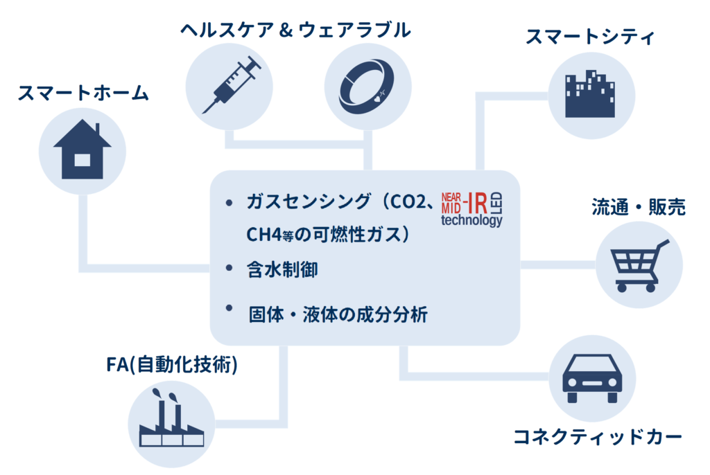 近赤外・中赤外LED(1.3~4.6μm)は、産業・生活を支える様々なセンシングに利用されています。