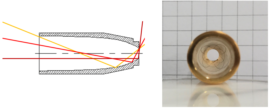 下の左側の簡易の光線追跡図を見ると判るように、あくまでCPC/Winston Coneは出射口=集光面へ光を集光するけれども、その後の振る舞いについては考慮された設計にはなっていないので、ファイバや細い導波管(導光管)などへの導光には適していない。
